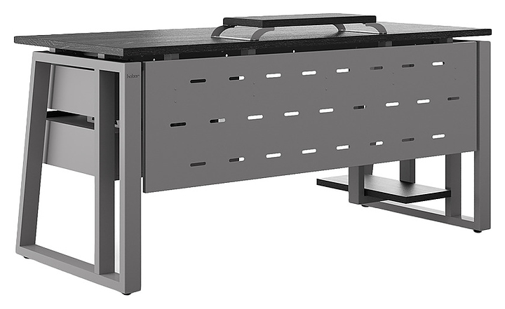 Офисный стол Кобор TS2-100/80 aluminum/glazed используется в офисных помещениях и кабинетах руководителей. Модель оснащена усиленными вертикальными балками опорами в форме наклонной трапеции. Каркас выполнен из металла, выкрашенного в цвет алюминиевый металлик (RAL9006), столешница – из ламинированной древесно-стружечной плиты (ЛДСП) цвета черный дуб (H3178 ST37). Опции (заказываются отдельно):