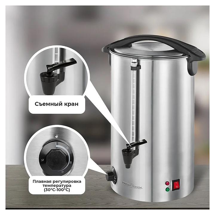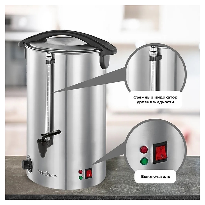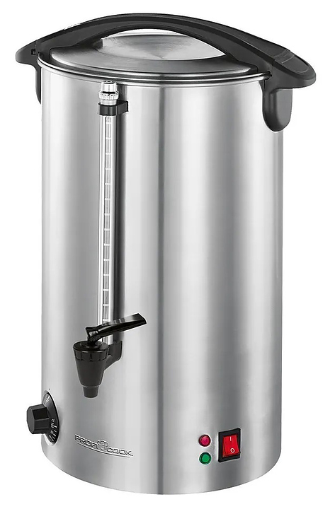 Термопот Profi Cook PC-HGA 1196 предназначен для подогрева воды и приготовления горячих напитков на предприятиях общественного питания и торговли, а также в домашних условиях. Модель оснащена кабелем питания с вилкой, краном для розлива, крышкой с дугообразной рукояткой, боковыми транспортировочными рукоятками и электромеханическим управлением. Корпус цилиндрической формы, крышка и нагревательный элемент выполнены из высококачественной нержавеющей стали, фурнитура – из черного пластика. Особенности: