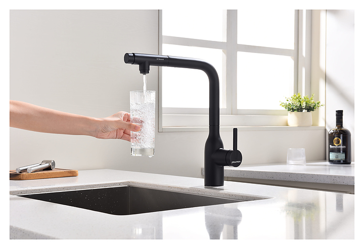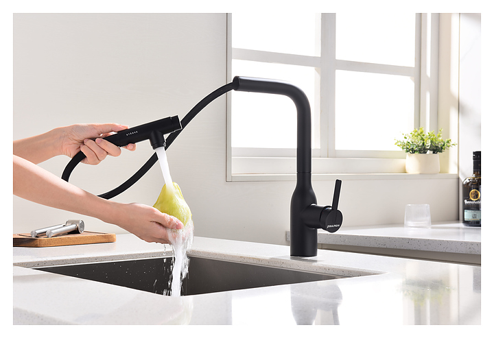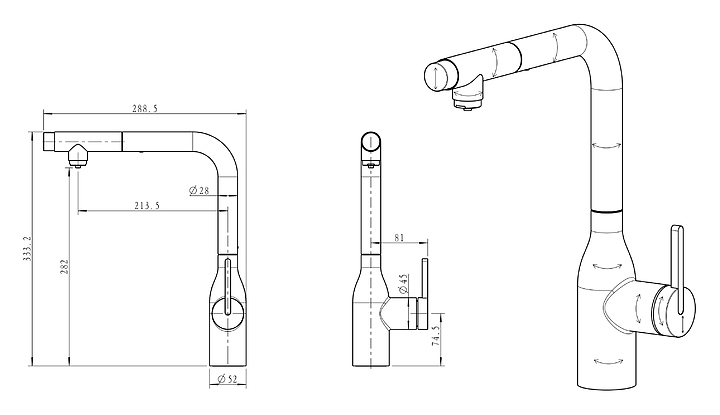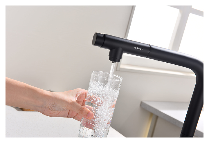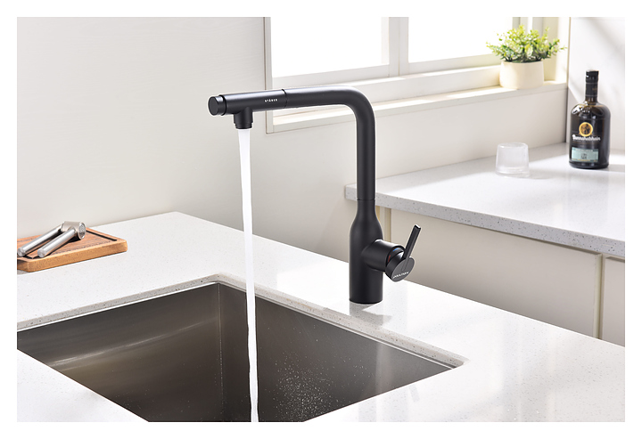 Смеситель Paulmark Viper Vi213105-401 предназначен для подачи горячей и холодной воды в кухонных помещениях. Модель оснащена вытяжным изливом и керамическим картриджем, обеспечивающим плавный ход рычага смесителя, контроль и точность при выборе напора и температуры воды. Фильтрованная вода подается через отдельные трубку и аэратор, что исключает смешивание с водопроводной водой. Изделие выполнено из латуни, отличающейся прочностью, долговечностью и устойчивостью к перепадам температуры. Дополнительные характеристики: