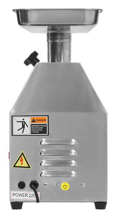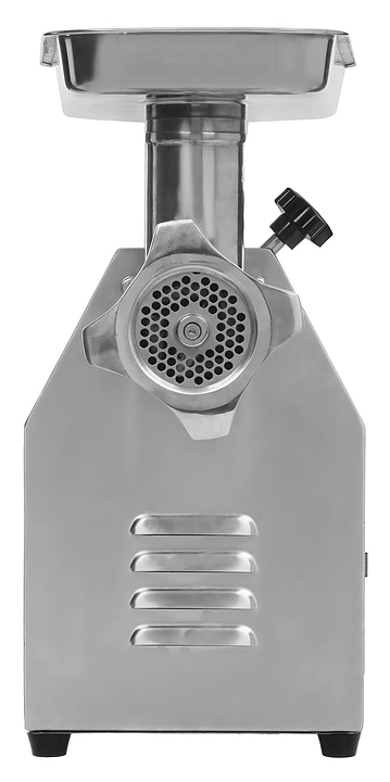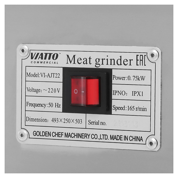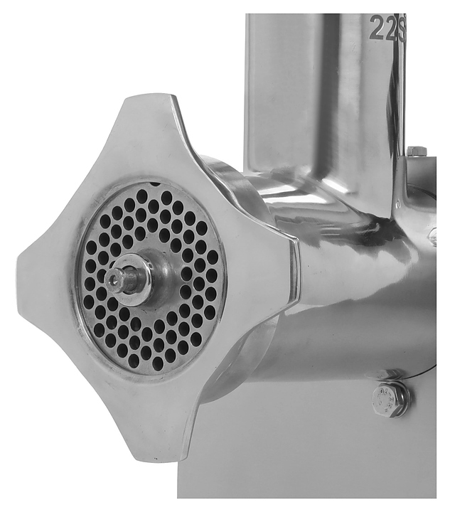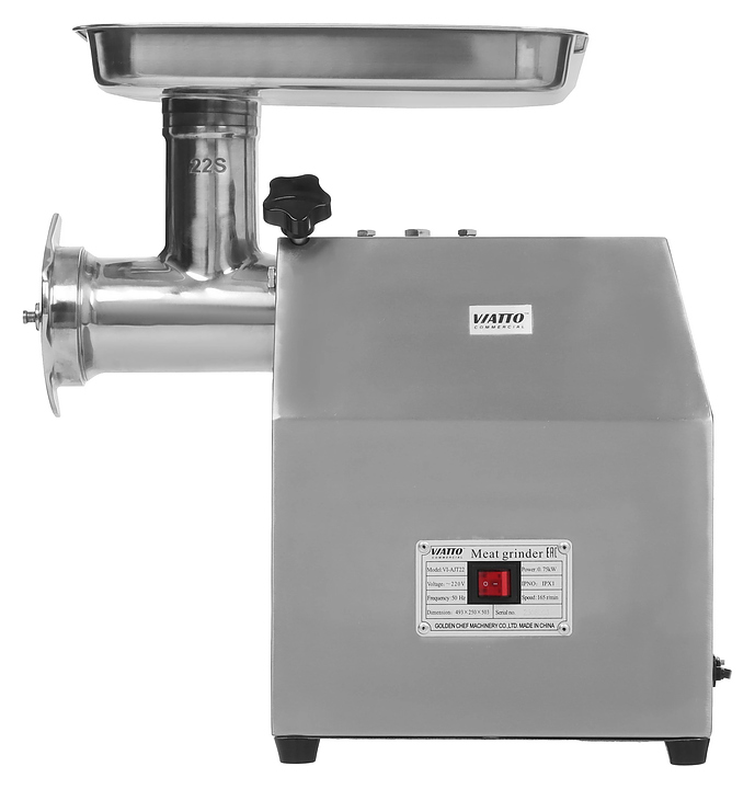 Мясорубка VIATTO VI-AJT22 используется на предприятиях общественного питания и торговли для измельчения мяса, птицы и рыбы на фарш, а также повторного измельчения котлетной массы. Модель оснащена режущей системой Enterprise. Корпус выполнен из нержавеющей стали AISI 201, нож, решетки, съемный режущий узел, шнек и рукав - из нержавеющей стали. В комплект поставки входят 2 решетки (6 и 8 мм), нож, насадка для колбасок и толкатель. Дополнительные характеристики: