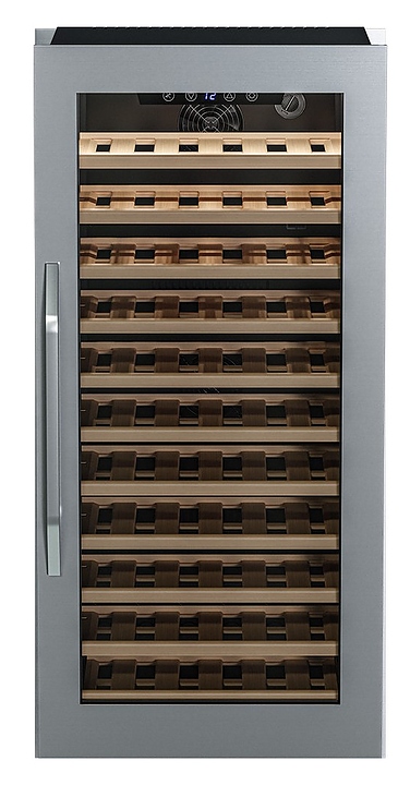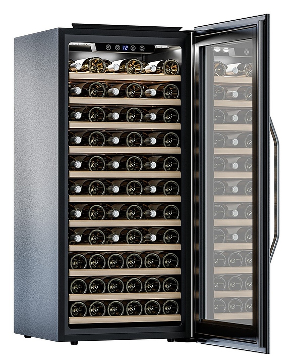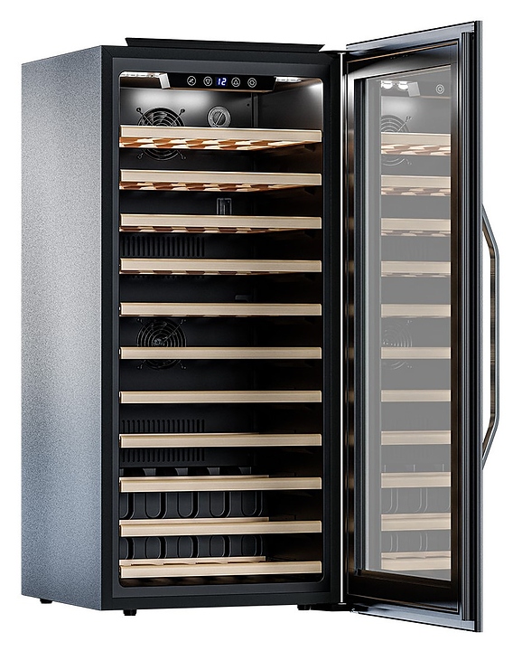Винный шкаф MEYVEL MV66-KSB1 предназначен для демонстрации, хранения и создания оптимальных условий для сохранения всех вкусовых свойств вина в бутылках на предприятиях общественного питания, торговли, в барах, ресторанах, специализированных магазинах, частных домах или квартирах. Модель оснащена удобным электронным управлением, белым панорамным освещением, угольным фильтром и регулируемыми по высоте ножками. Корпус и дверная ручка выполнены из стали, дверь - из двойного стекла с УФ защитой со стальной окантовкой, полки - из массива бука. Особенности: