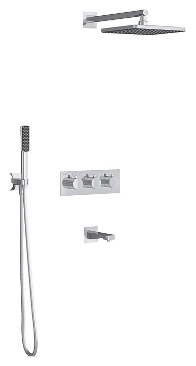 Душевой комплект Teska Lande Thermostat T4000C используется в ванных комнатах. Модель оснащена квадратным верхним душем и продолговатой ручной лейкой. Термостатический картридж обеспечивает подачу воды заданной температуры, что исключает ожоги. Водоотталкивающее покрытие гарантирует простой уход. Изделие выполнено из высококачественной латуни, которая отличается прочностью, долговечностью и устойчивостью к перепадам температур. В комплект поставки входят смеситель, излив, верхний душ и ручная лейка. Дополнительные характеристики: