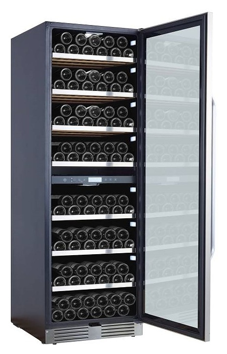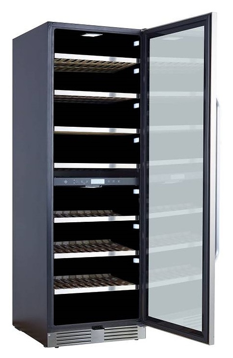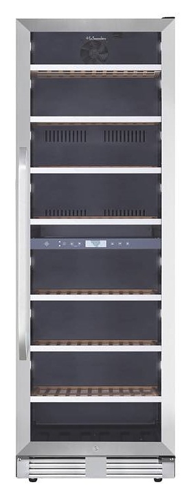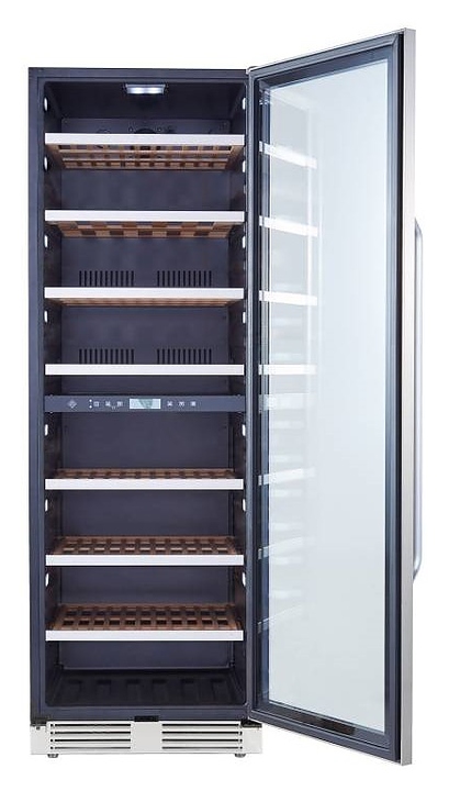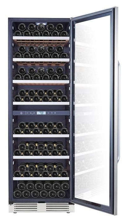 Винный шкаф La Sommeliere MT150DZ предназначен для хранения бутилированного вина в ресторанах, специализированных магазинах, подсобных складских помещениях, в частных домах или квартирах. Модель оснащена 2 независимыми температурными отсеками, сенсорным цифровым дисплеем, боковым и потолочным освещением, 7 полками, съемной вентиляционной решеткой, замком и 4 регулируемыми ножками. Дверь выполнена из стеклопакета с УФ защитой, полки - из дерева с фасадом из нержавеющей стали. Особенности: