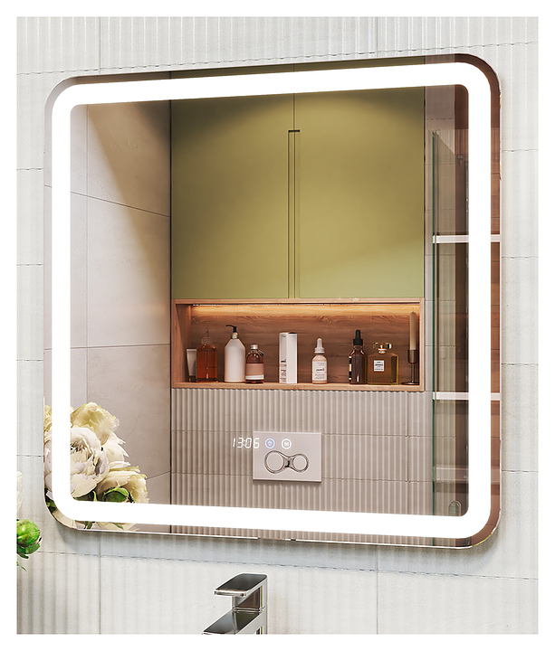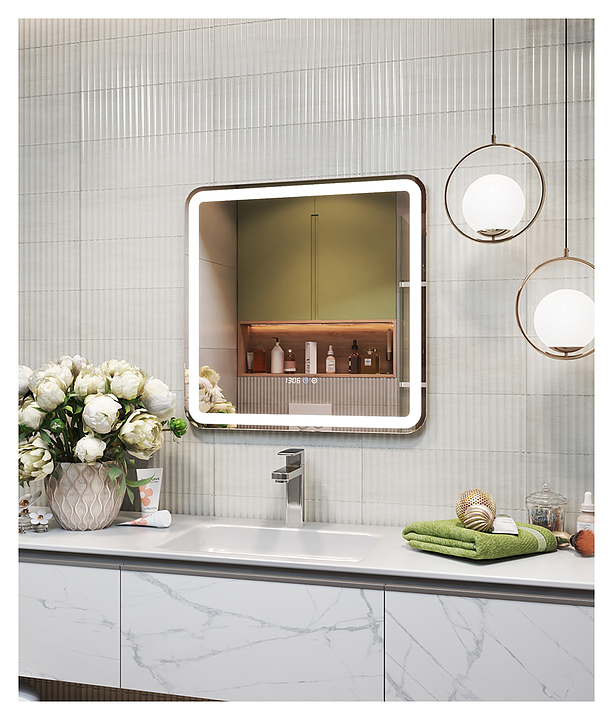 Зеркало VIGO Grani Luxe выполнено в современном стиле и отлично дополнит интерьер любой ванной комнаты. Благодаря подвесной конструкции модель не занимает много места, что позволяет экономить пространство в ванной комнате. Зеркало оснащено LED-подсветкой по периметру, сенсорным управлением, встроенными часами и функцией антизапотевания с таймером отключения. Корпус выполнен из прочного ABS-пластика, за счет уникальной технологии производства изделие не подвержено ржавлению амальгамы, дымчатости и ухудшению отражающей способности в помещениях с высокой влажностью. Дополнительные характеристики:
