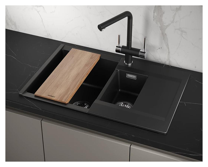 Мойка ESTETICA 7808 предназначена для рационального планирования рабочего места на кухне. Вместительная чаша большого размера и небольшая дополнительная чаша расположены параллельно друг другу. Крыло-сушилка служит подставкой для посуды и продуктов, возможна установка измельчителя. Изделие выполнено из кварца, который отличается способностью поглощать шум воды, стойкостью к действию моющих средств, экологичностью и долговечностью, разделочная доска - из ясеня. В комплект поставки входят слив-перелив, сифон и разделочная доска. Дополнительные характеристики: