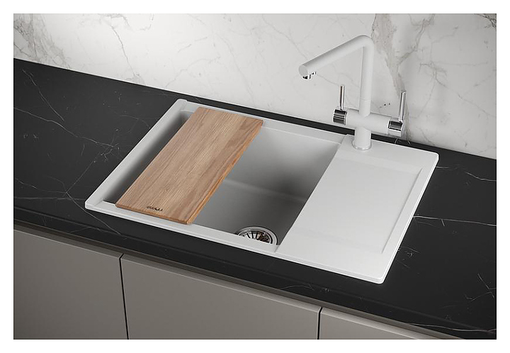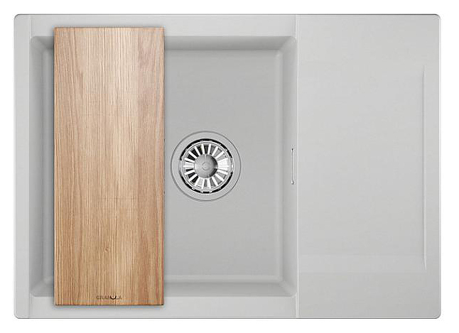 Мойка ESTETICA 7003 предназначена для рационального планирования рабочего места на кухне. Крыло-сушилка служит подставкой для посуды и продуктов. Модель подходит для установки кухонных измельчителей. Изделие выполнено из кварца, который отличается способностью поглощать шум воды, стойкостью к действию моющих средств, экологичностью и долговечностью, разделочная доска - из ясеня. В комплект поставки входят слив-перелив, сифон и разделочная доска. Дополнительные характеристики: