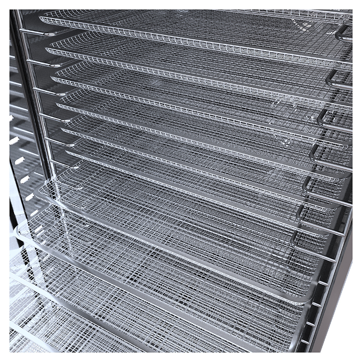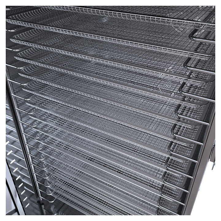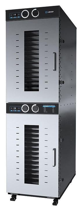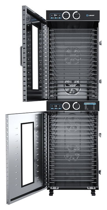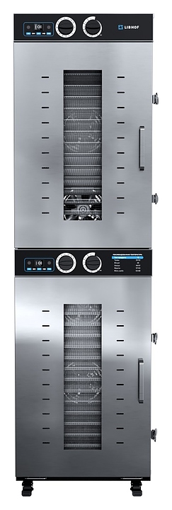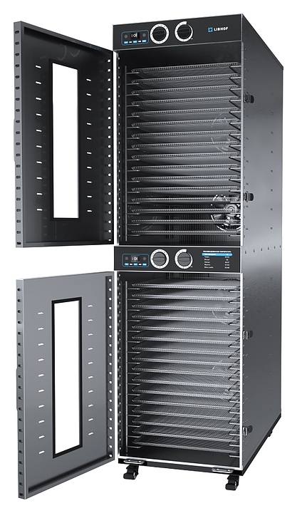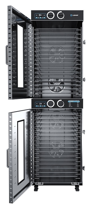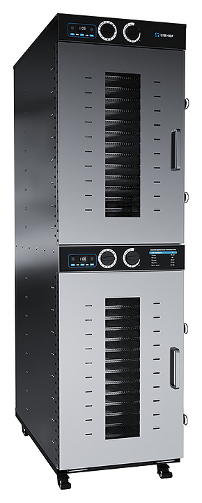 Дегидратор Libhof FDT-32D используется на предприятиях пищевой промышленности, общественного питания и торговли для сушки овощей, фруктов, ягод, грибов и трав, вяления рыбы, расстойки теста, приготовления сухариков, пастилы и йогурта. Модель оснащена 2 независимыми камерами с 16 уровнями направляющих для размещения поддонов в каждой камере, распашными дверьми с вертикальными рукоятками, расположенными в задних стенках вентиляторами и нагревательными элементами, кабелем питания и электромеханическими панелями управления. Корпус и поддоны выполнены из высококачественной нержавеющей стали. В комплект поставки входят 32 съемных решетчатых поддона, мелкоячеистая сетка, 8 лотков для пастилы и инструкция по эксплуатации. Особенности: