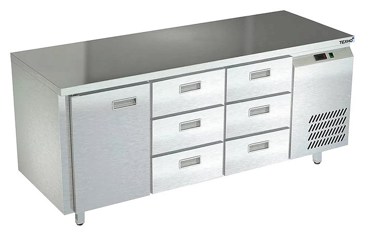 Морозильный стол Техно-ТТ СПБ/М-122/16-1806 предназначен для раскатки теста, обработки, заморозки и долговременного хранения продуктов, полуфабрикатов, напитков и мороженого на предприятиях общественного питания и торговли. Модель оснащена 1 секцией с дверью и регулируемой полкой-решеткой, 2 секциями с 6 ящиками, направляющими с доводчиками (Австрия), петлями-доводчиками (Польша) и круглыми ножками, регулируемыми по высоте на 50 мм (Италия). Корпус и столешница выполнены из нержавеющей стали AISI 430, задняя стенка и дно - из оцинкованной стали. Стол поставляется в собранном виде. Особенности: