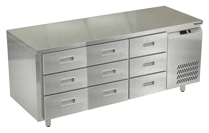 Морозильный стол Техно-ТТ СПБ/М-123/09-1806 предназначен для раскатки теста, обработки, заморозки и долговременного хранения продуктов, полуфабрикатов, напитков и мороженого на предприятиях общественного питания и торговли. Модель оснащена 3 секциями с 9 ящиками, направляющими с доводчиками (Австрия) и круглыми ножками, регулируемыми по высоте на 50 мм (Италия). Корпус и столешница выполнены из нержавеющей стали AISI 430, задняя стенка и дно - из оцинкованной стали. Стол поставляется в собранном виде. Особенности: