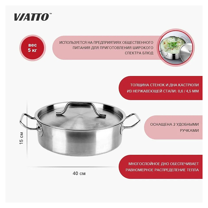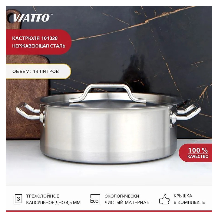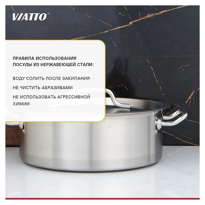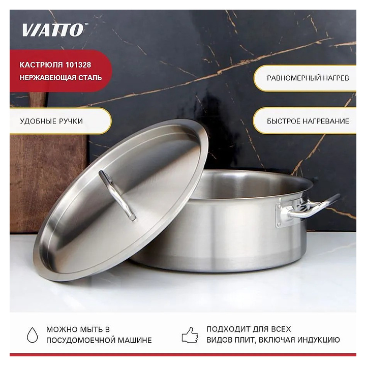 Кастрюля VIATTO 101328 используется на предприятиях общественного питания и торговли, в частных домах и квартирах для приготовления широкого спектра блюд. Модель оснащена 2 ручками на заклепках. Изделие выполнено из нержавеющей стали, дно - тройное. В комплект поставки входит крышка.