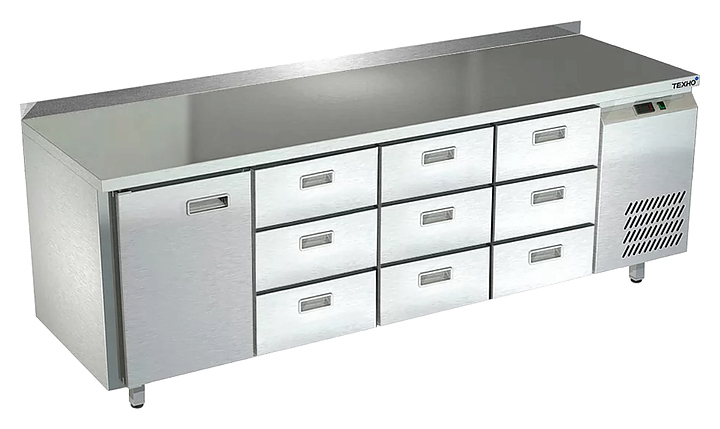 Морозильный стол Техно-ТТ СПБ/М-222/19-2207 предназначен для раскатки теста, обработки, заморозки и долговременного хранения продуктов, полуфабрикатов, напитков и мороженого на предприятиях общественного питания и торговли. Модель оснащена 1 секцией с дверью и регулируемой полкой-решеткой, 3 секциями с 9 ящиками, направляющими с доводчиками (Австрия), петлями-доводчиками (Польша), бортом и круглыми ножками, регулируемыми по высоте на 50 мм (Италия). Корпус и столешница выполнены из нержавеющей стали AISI 430, задняя стенка и дно - из оцинкованной стали. Стол поставляется в собранном виде. Особенности: