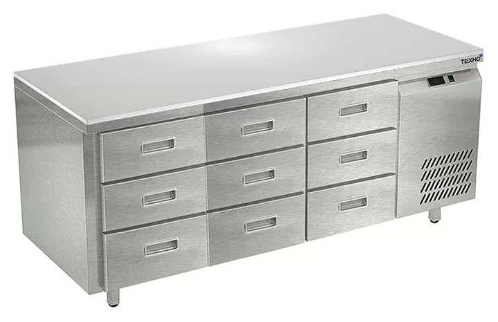 Морозильный стол Техно-ТТ СПБ/М-523/09-1806 предназначен для раскатки теста, обработки, заморозки и долговременного хранения продуктов, полуфабрикатов, напитков и мороженого на предприятиях общественного питания и торговли. Модель оснащена 3 секциями с 9 ящиками, направляющими с доводчиками (Австрия) и круглыми ножками, регулируемыми по высоте на 50 мм (Италия). Корпус выполнен из нержавеющей стали AISI 430, задняя стенка и дно - из оцинкованной стали, столешница - из полипропилена. Стол поставляется в собранном виде. Особенности: