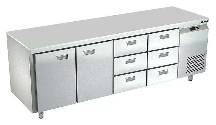 Морозильный стол Техно-ТТ СПБ/М-522/26-2206 предназначен для раскатки теста, обработки, заморозки и долговременного хранения продуктов, полуфабрикатов, напитков и мороженого на предприятиях общественного питания и торговли. Модель оснащена 2 секциями с 2 дверьми и регулируемой полкой-решеткой, 2 секциями с 6 ящиками, направляющими с доводчиками (Австрия), петлями-доводчиками (Польша) и круглыми ножками, регулируемыми по высоте на 50 мм (Италия). Корпус выполнен из нержавеющей стали AISI 430, задняя стенка и дно - из оцинкованной стали, столешница - из полипропилена. Стол поставляется в собранном виде. Особенности: