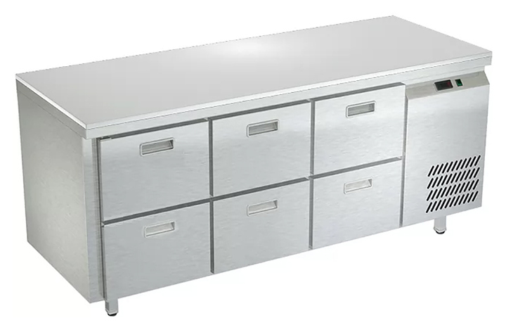 Морозильный стол Техно-ТТ СПБ/М-523/06-1807 предназначен для раскатки теста, обработки, заморозки и долговременного хранения продуктов, полуфабрикатов, напитков и мороженого на предприятиях общественного питания и торговли. Модель оснащена 3 секциями с 6 ящиками, направляющими с доводчиками (Австрия) и круглыми ножками, регулируемыми по высоте на 50 мм (Италия). Корпус выполнен из нержавеющей стали AISI 430, задняя стенка и дно - из оцинкованной стали, столешница - из полипропилена. Стол поставляется в собранном виде. Особенности: