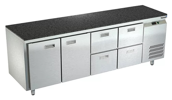 Морозильный стол Техно-ТТ СПБ/М-322/24-2206 предназначен для раскатки теста, обработки, заморозки и долговременного хранения продуктов, полуфабрикатов, напитков и мороженого на предприятиях общественного питания и торговли. Модель оснащена 2 секциями с 2 дверьми и регулируемой полкой-решеткой, 2 секциями с 2 ящиками, направляющими с доводчиками (Австрия), петлями-доводчиками (Польша) и круглыми ножками, регулируемыми по высоте на 50 мм (Италия). Корпус выполнен из нержавеющей стали AISI 430, задняя стенка и дно - из оцинкованной стали, столешница - из камня. Стол поставляется в собранном виде. Особенности: