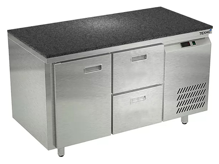 Морозильный стол Техно-ТТ СПБ/М-322/12-1307 предназначен для раскатки теста, обработки, заморозки и долговременного хранения продуктов, полуфабрикатов, напитков и мороженого на предприятиях общественного питания и торговли. Модель оснащена 1 секцией с дверью и регулируемой полкой-решеткой, 1 секцией с 2 ящиками, направляющими с доводчиками (Австрия), петлями-доводчиками (Польша) и круглыми ножками, регулируемыми по высоте на 50 мм (Италия). Корпус выполнен из нержавеющей стали AISI 430, задняя стенка и дно - из оцинкованной стали, столешница - из камня. Стол поставляется в собранном виде. Особенности: