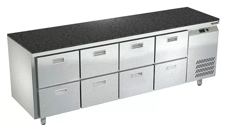 Морозильный стол Техно-ТТ СПБ/М-323/08-2207 предназначен для раскатки теста, обработки, заморозки и долговременного хранения продуктов, полуфабрикатов, напитков и мороженого на предприятиях общественного питания и торговли. Модель оснащена 4 секциями с 8 ящиками, направляющими с доводчиками (Австрия) и круглыми ножками, регулируемыми по высоте на 50 мм (Италия). Корпус выполнен из нержавеющей стали AISI 430, задняя стенка и дно - из оцинкованной стали, столешница - из камня. Стол поставляется в собранном виде. Особенности: