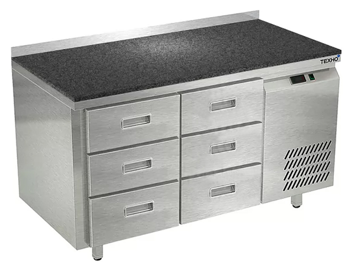 Морозильный стол Техно-ТТ СПБ/М-423/06-1307 предназначен для раскатки теста, обработки, заморозки и долговременного хранения продуктов, полуфабрикатов, напитков и мороженого на предприятиях общественного питания и торговли. Модель оснащена 2 секциями с 6 ящиками, направляющими с доводчиками (Австрия), бортом и круглыми ножками, регулируемыми по высоте на 50 мм (Италия). Корпус выполнен из нержавеющей стали AISI 430, задняя стенка и дно - из оцинкованной стали, столешница - из камня. Стол поставляется в собранном виде. Особенности: