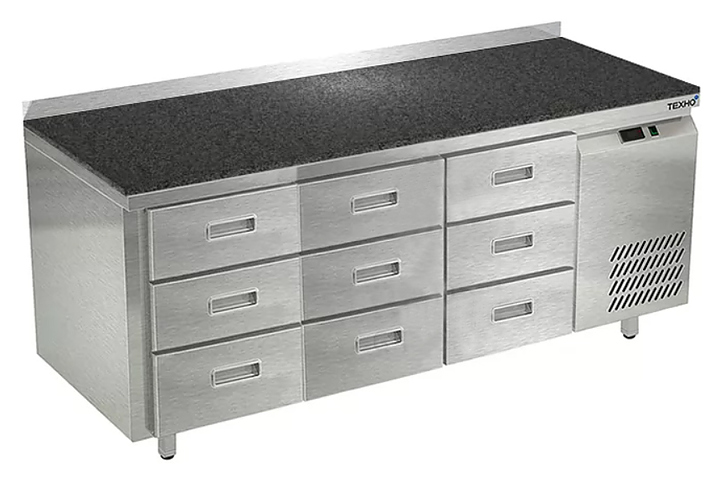 Морозильный стол Техно-ТТ СПБ/М-423/09-1807 предназначен для раскатки теста, обработки, заморозки и долговременного хранения продуктов, полуфабрикатов, напитков и мороженого на предприятиях общественного питания и торговли. Модель оснащена 3 секциями с 9 ящиками, направляющими с доводчиками (Австрия), бортом и круглыми ножками, регулируемыми по высоте на 50 мм (Италия). Корпус выполнен из нержавеющей стали AISI 430, задняя стенка и дно - из оцинкованной стали, столешница - из камня. Стол поставляется в собранном виде. Особенности: