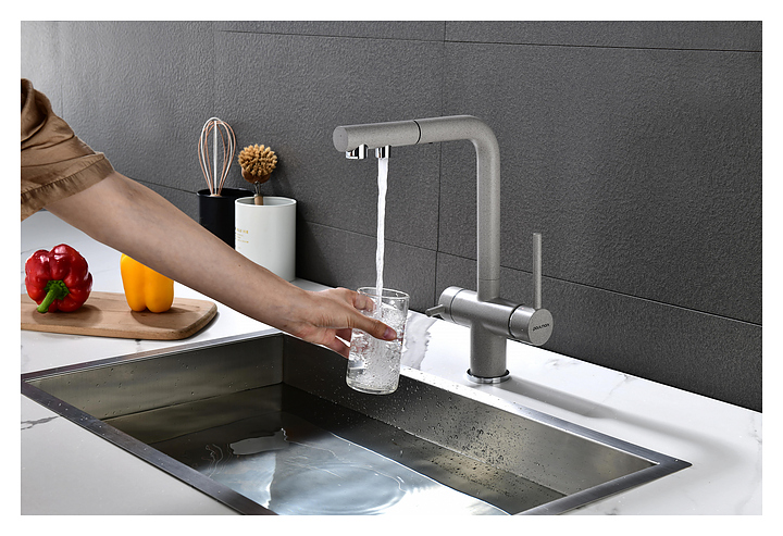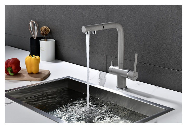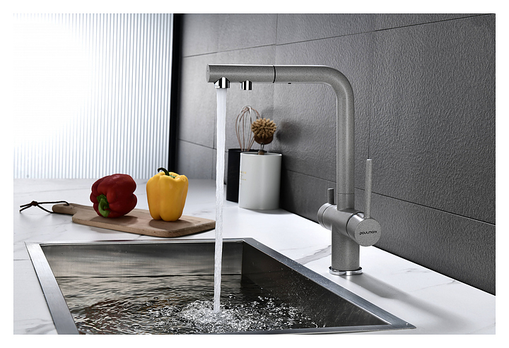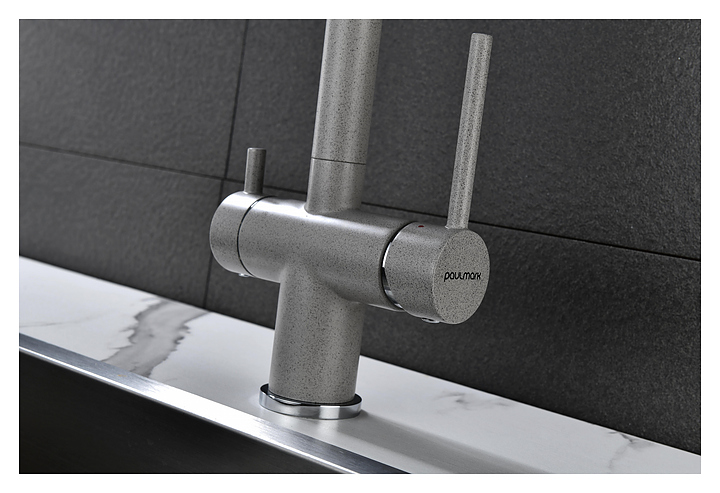 Смеситель Paulmark Serpentine Se213222-DG предназначен для подачи горячей и холодной воды в кухонных помещениях. Модель оснащена вытяжным изливом, каналом для фильтрованной воды и керамическим картриджем, обеспечивающим плавный ход рычага смесителя, контроль и точность при выборе напора и температуры воды. Смеситель монтируется с помощью гайки. Изделие выполнено из латуни, отличающейся прочностью, долговечностью и устойчивостью к перепадам температуры. Дополнительные характеристики: