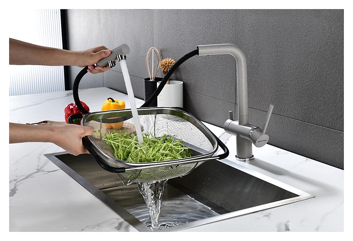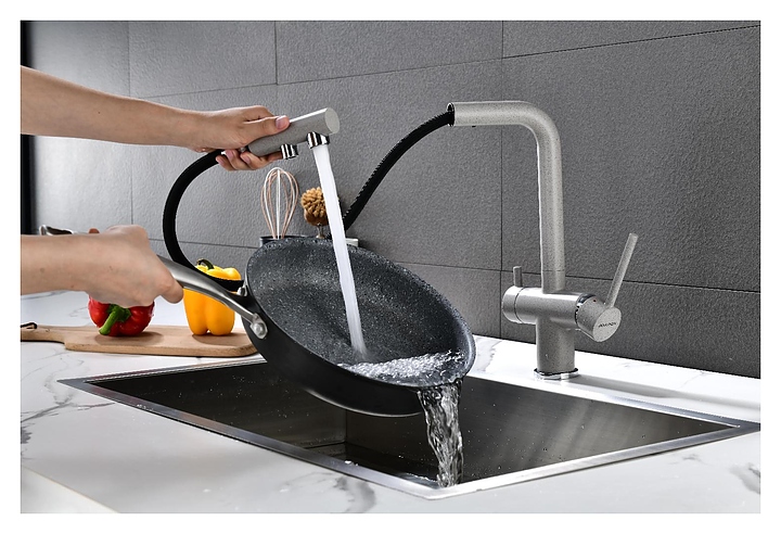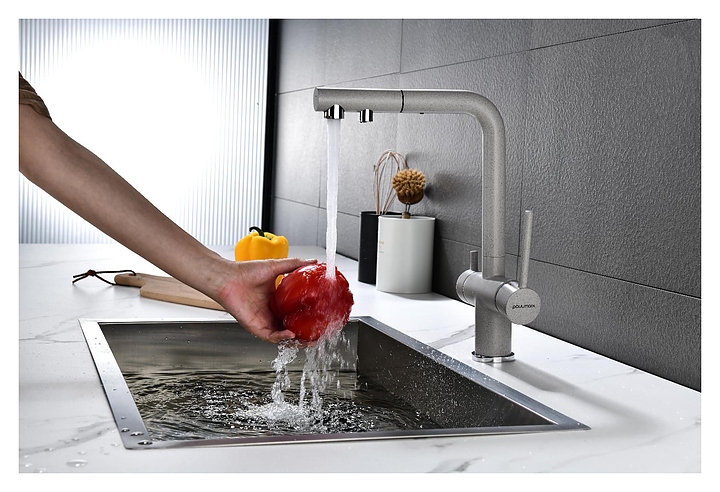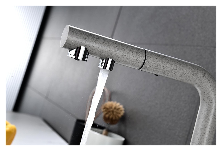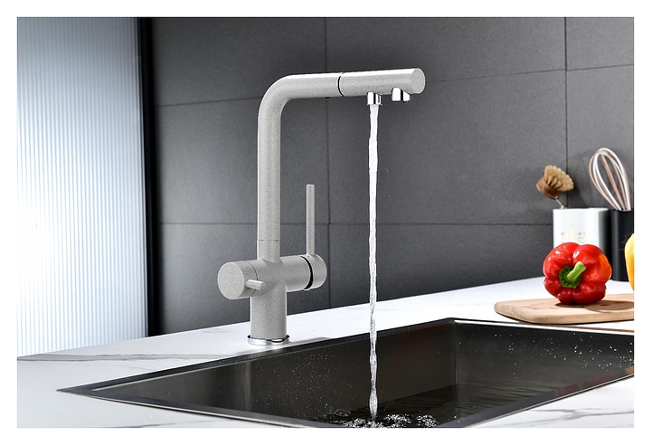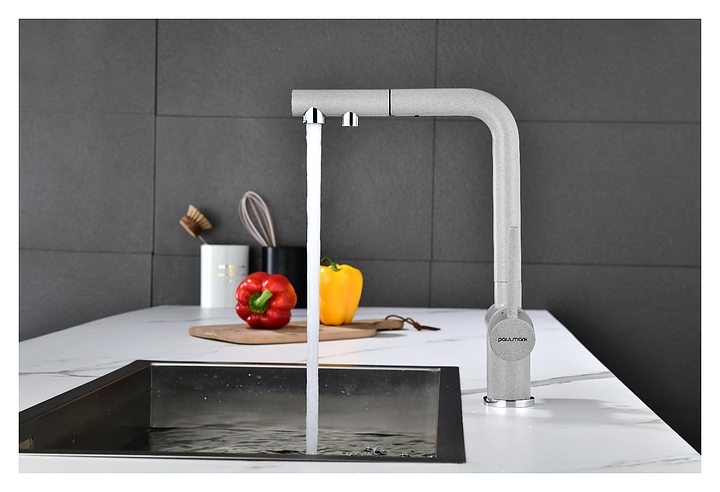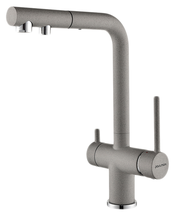 Смеситель Paulmark Serpentine Se213222-GR предназначен для подачи горячей и холодной воды в кухонных помещениях. Модель оснащена вытяжным изливом, каналом для фильтрованной воды и керамическим картриджем, обеспечивающим плавный ход рычага смесителя, контроль и точность при выборе напора и температуры воды. Смеситель монтируется с помощью гайки. Изделие выполнено из латуни, отличающейся прочностью, долговечностью и устойчивостью к перепадам температуры. Дополнительные характеристики:
