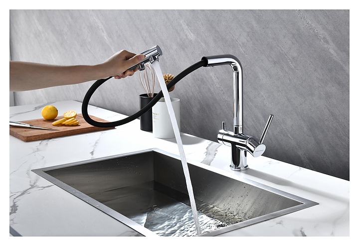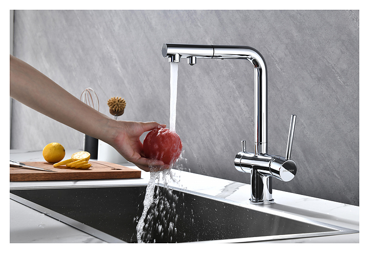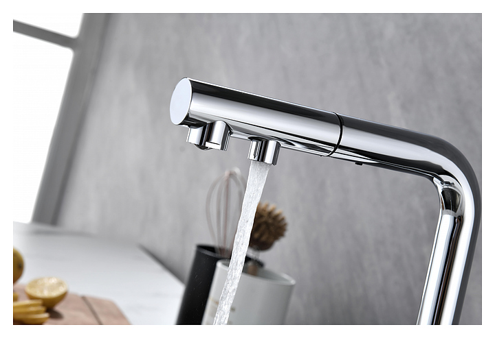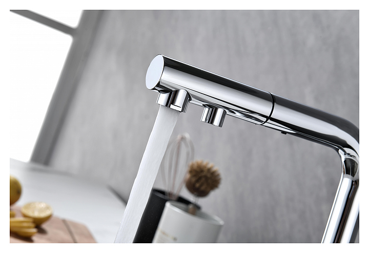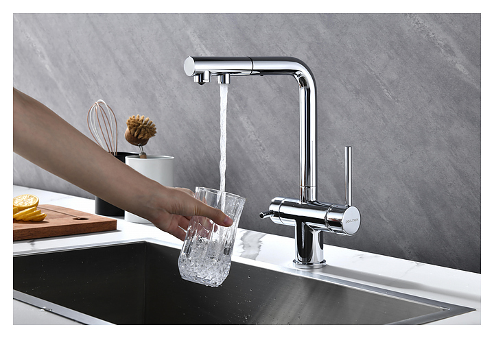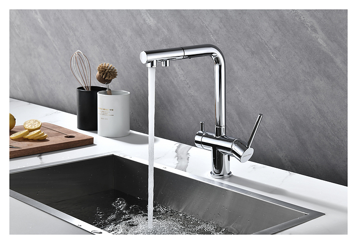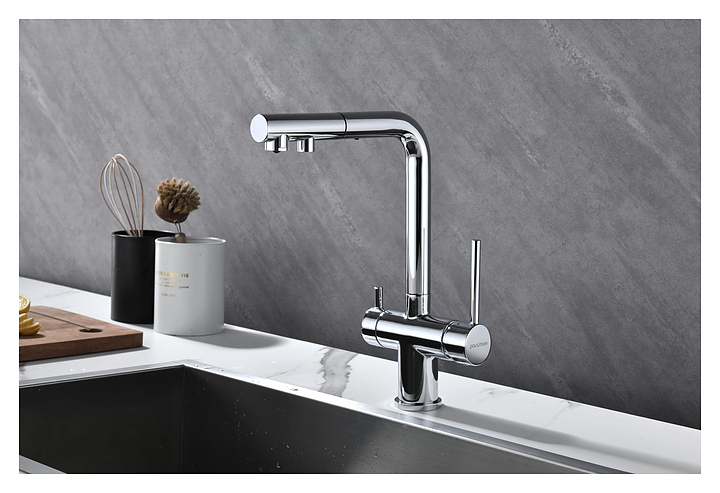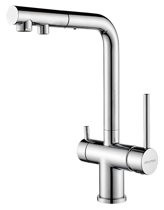 Смеситель Paulmark Serpentine Se213222-CR предназначен для подачи горячей и холодной воды в кухонных помещениях. Модель оснащена вытяжным изливом, каналом для фильтрованной воды и керамическим картриджем, обеспечивающим плавный ход рычага смесителя, контроль и точность при выборе напора и температуры воды. Смеситель монтируется с помощью гайки. Изделие выполнено из латуни, отличающейся прочностью, долговечностью и устойчивостью к перепадам температуры. Дополнительные характеристики: