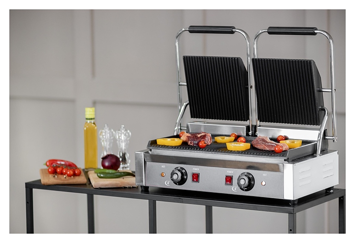 Контактный гриль Rosso HSG57E PRO предназначен для жарки, быстрого приготовления и разогрева блюд из мяса, рыбы, птицы и полуфабрикатов на предприятиях общественного питания и торговли. Одновременное воздействие на продукты сразу 2 рабочих поверхностей обеспечивает равномерную прожарку. Модель оснащена индикаторами работы и нагрева и поддоном для сбора жира. Корпус выполнен из нержавеющей стали.