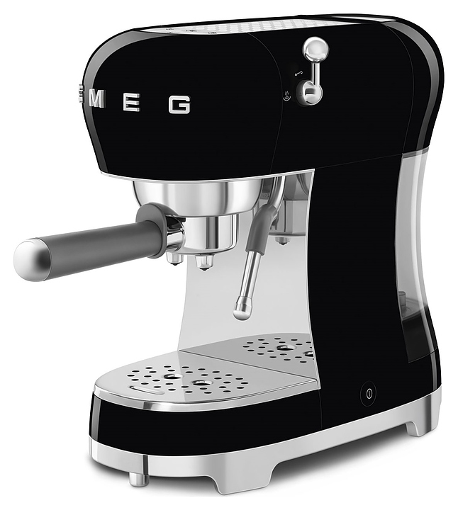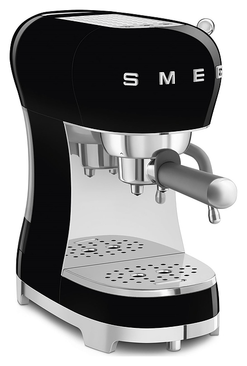 Эспрессо кофемашина SMEG ECF02BLEU предназначена для приготовления кофе эспрессо и напитков на его основе в домашних условиях. Модель оснащена кабелем питания с евровилкой (Shuko) и панелью управления с нажимными кнопками. Корпусы прибора и основания подставки для чашек выполнены из пластика с внешней глянцевой поверхностью черного цвета, основание прибора – из пластика с покрытием цвета полированный хром, бойлер, трубка подачи горячей воды / пара, подогреватель и поддон для чашек, фильтры, корпус холдера – из нержавеющей стали, резервуар для воды – из сополимера стирола и акрилонитрила (SAN), рукоятка холдера – из серого пластика, кнопки и накладные объемные литеры логотипа – из пластика с серебристым покрытием. Комплектация: