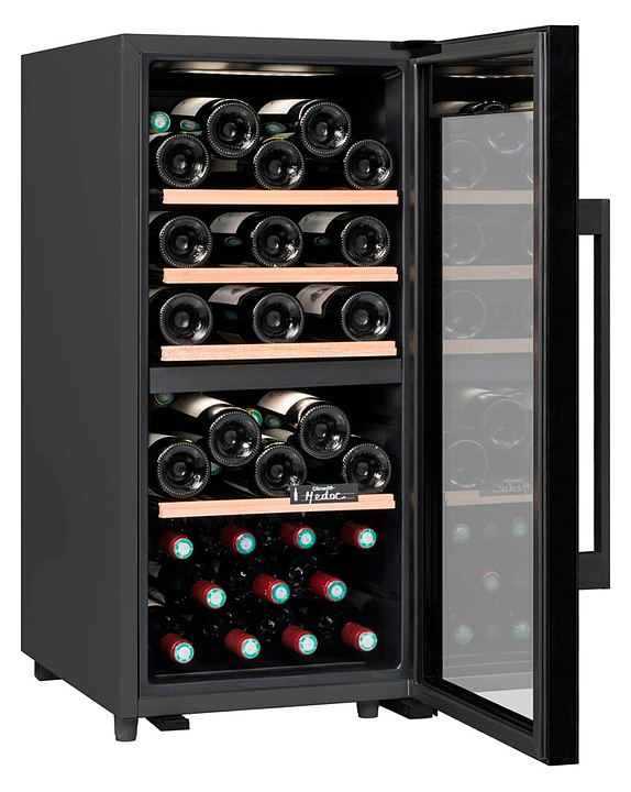 Винный шкаф Climadiff CLD40B1 предназначен для хранения вина при определенном уровне влажности и температуры в ресторанах, специализированных магазинах, отелях, подсобных складских помещениях, в частных домах или квартирах. Модель оснащена сенсорной панелью управления, расположенной на дверце и 2 регулируемыми ножками. Полки выполнены из стальной проволоки с фасадом из дерева. Особенности: