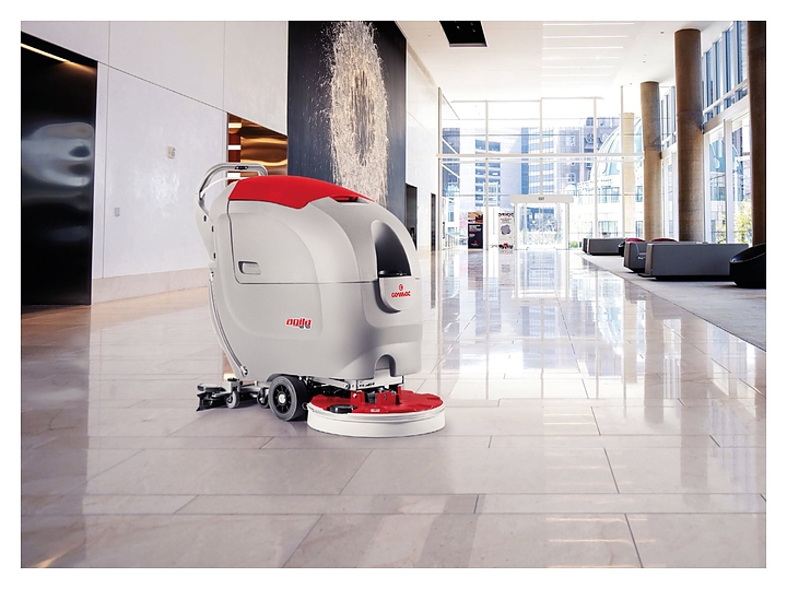 Поломоечная машина Comac Agila 50/50 BT предназначена для технической уборки помещений средних размеров даже с загроможденными пространствами, таких как торговые точки, автосервисы, спортзалы или медицинские помещения. Модель оcнащена дисковой щеткой, питанием от тяговых батарей с ходовым двигателем и 4 колесами для максимальной устойчивости. Корпус изготовлен из ударопрочного пластика, рама и крепление скребка - из литого алюминия. Особенности: