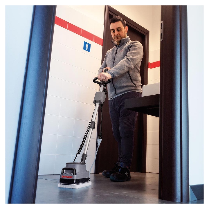 Орбитальная однодисковая машина Comac CM Mini Orbital B предназначена для уборки, мойки, полировки и шлифования краев и углов в ограниченных и труднодоступных пространствах в производственных цехах, на складах, в торговых центрах, супермаркетах, логистических центрах. Модель оснащена эргономичной рукояткой. Рама выполнена из нержавеющей стали, кожух - из полипропилена. Особенности: