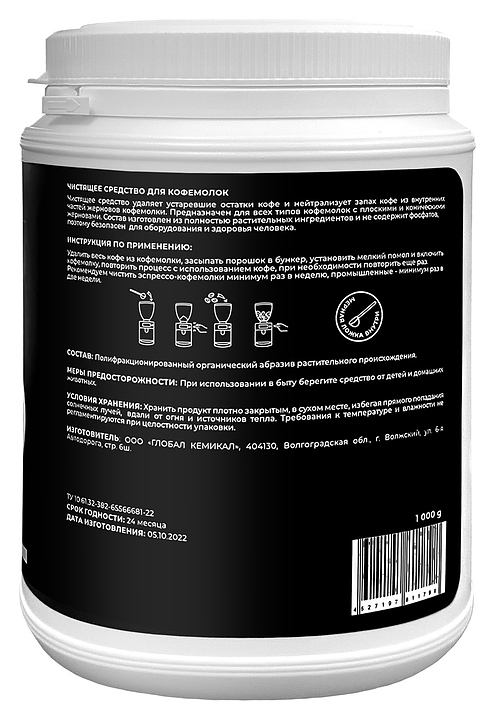 Порошковое средство CUP 2 используется не предприятиях общественного питания и торговли для эффективной очистки жерновов кофемолок всех типов кроме встроенных в автоматические кофемашины от остатков кофе и кофейных масел. Полифракционированный органический абразив растительного происхождения не содержит глютен, безопасен для оборудования и здоровья человека. Формула разработана в Италии. Порошок поставляется в цилиндрической банке со съемной крышкой. В комплект поставки входит мерная ложка. Дополнительные характеристики: