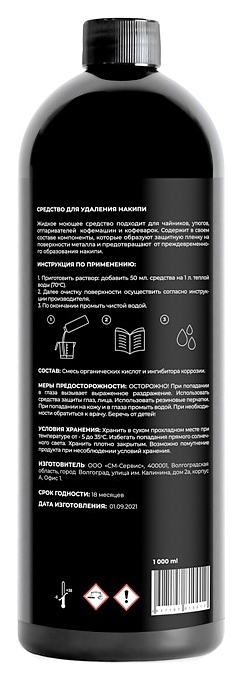 Жидкое средство CUP 3 используется не предприятиях общественного питания и торговли для защиты от накипи внутренних компонентов кофемашин и кофеварок всех типов, а также чайников и утюгов. Концентрат применяется в растворе с водой и отличается экономичным расходом. Состав: смесь органических кислот и ингибиторов коррозии. Жидкость поставляется в бутыли с завинчивающейся крышкой. Дополнительные характеристики: