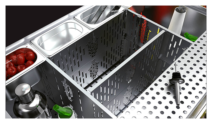 Барный модуль БАР-РУС БР-Б/99 Ледовая крепость входит в состав барного комплекса "Ансамбль" и предназначен для расположения нескольких видов льда, коктейльных ингредиентов, наполнителей и напитков на предприятиях общественного питания и торговли. Модель состоит из основания, ликерной лестницы, барной ванны для льда и кармана для бутылок. Основание и столешница изготовлены из нежавеющей стали AISI 304, гастроемкости - из нержавеющей стали AISI 201, спил-стоп - из нержавеющей стали AISI 430. В комплект поставки входят гастроемкости GN 1/9. Особенности: