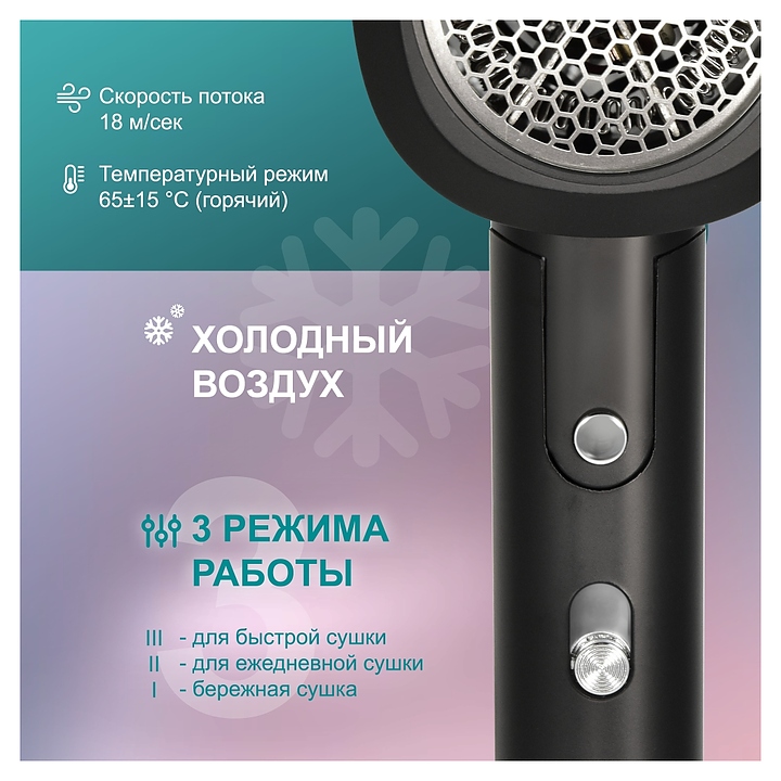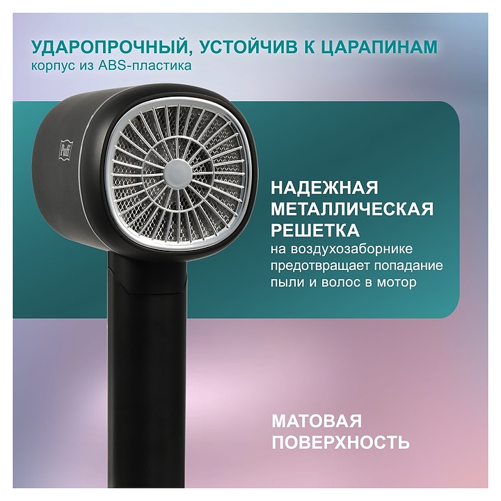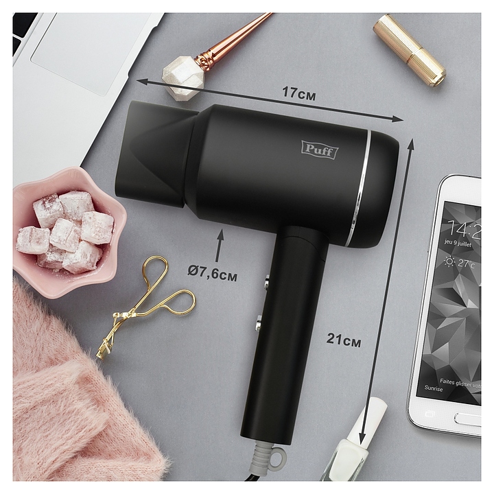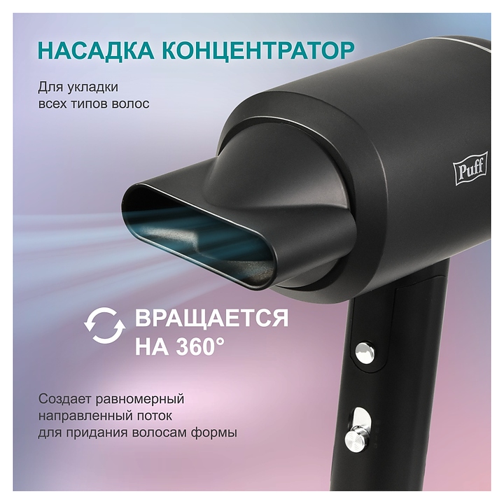 Фен Puff 1801 предназначен для быстрой сушки и комфортной укладки в спорткомплексах, фитнес-центрах, бассейнах, отелях, гостиницах, частных домах и квартирах. Модель оснащена 3 режимами сушки по температуре и опцией холодного воздуха. Насадка концентратор создает равномерный направленный поток для придания волосам необходимой формы. Сетка воздухозаборника с мельчайшими ячейками препятствует попаданию пыли в мотор. Корпус выполнен из ударопрочного ABS-пластика. В комплект поставки входит насадка. Особенности: