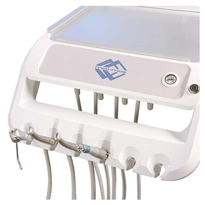 Стоматологическая установка Med-Mos CQ-218 Style нижняя подача с РУ используется в стоматологических кабинетах и клиниках для осмотра ротовой полости пациентов, лечения зубов и выполнения других стоматологических процедур. Модель оснащена пантографическим плечом с пневматическим тормозом и стоматологической лампой с сенсорным управлением. Каркас кресла пациента и станины выполнены из стали с высококачественным полимерно-порошковым покрытием, с накладками из ПВХ-пластика, обивка из ПУ-кожи "микрофибер" с эластичным ППУ-наполнителем и ABS-пластик в ножной части, пантографическое плечо - из ABS-пластика, стали и алюминиевого сплава с высококачественным полимерно-порошковым покрытием. Стоматологическая установка поставляется с регистрационным удостоверением Минздрава РФ. Комплектация:
