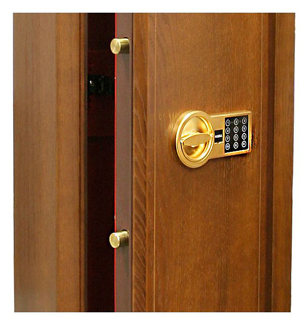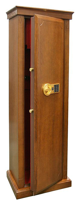 Оружейный сейф Valberg Заслон EL Д предназначен для безопасного хранения длинноствольного огнестрельного оружия, патронов и аксессуаров в гостиницах, отелях, частных домах и квартирах. Модель оснащена распашной дверью и внутренним патронным отделением (трейзером), запирающимся на ключ. Корпус выполнен из натурального дерева и шпона дуба, внутренняя обивка – из бархата, покрытие замка – 24-каратное золото. Особенности: