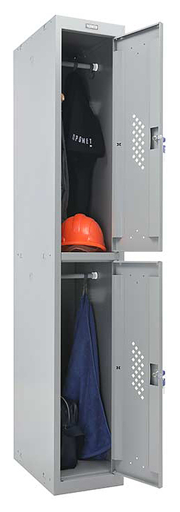 Шкаф для одежды ПРОМЕТ Практик Усиленный ML-12-30 используется на предприятиях общественного питания и торговли, а также в производственных помещениях для хранения одежды и личных вещей персонала. Модель имеет 2 секции, каждая из которых оснащена запираемой на ключ распашной дверцей, перекладиной и крючками. Корпус выполнен из стали, окрашенной методом порошкового напыления. Особенности: