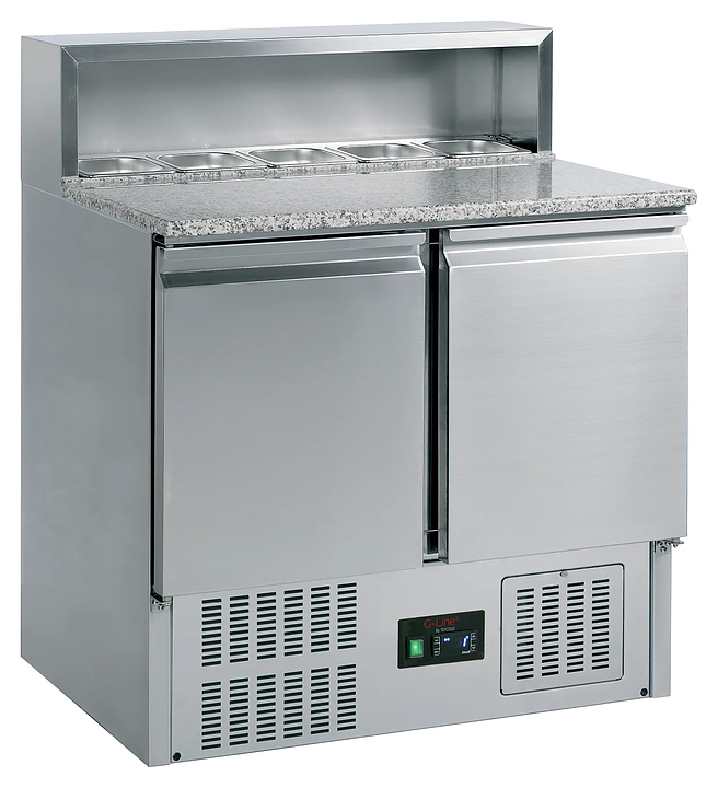 Стол для пиццы TEFCOLD GP92 используется на предприятиях общественного питания и торговли для обработки ингредиентов, используемых для приготовления пиццы, охлаждения и кратковременного хранения продуктов. Прибор оснащен 2 распашными глухими дверьми, термометром, неоновой подсветкой верхней панели, 2 решатчатыми белыми полками GN1/1 и 4 регулируемыми ножками. Шкаф выполнен из нержавеющей стали SS201, столешница - из гранита. Особенности: