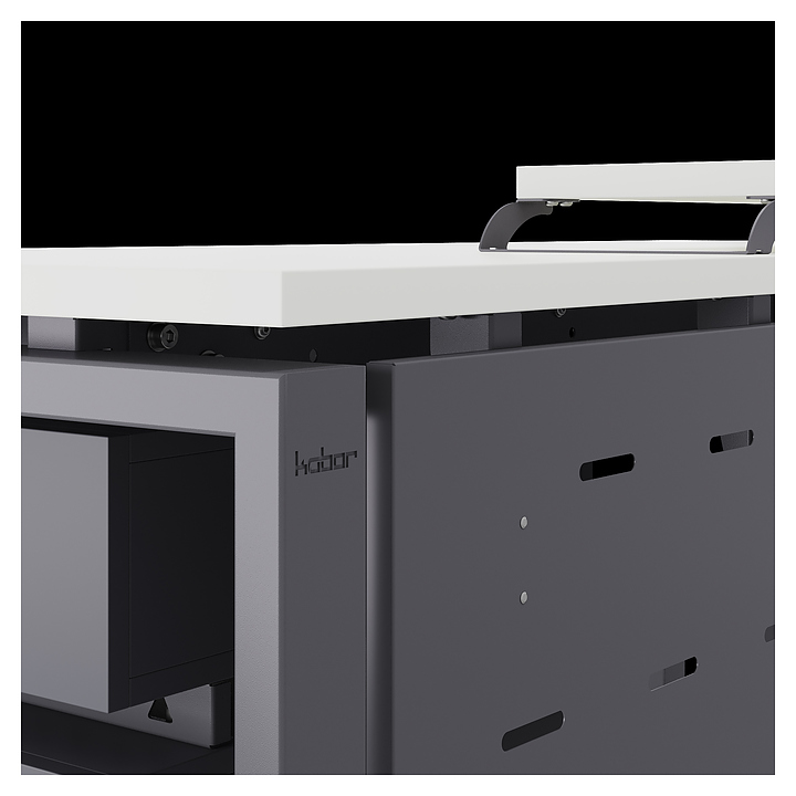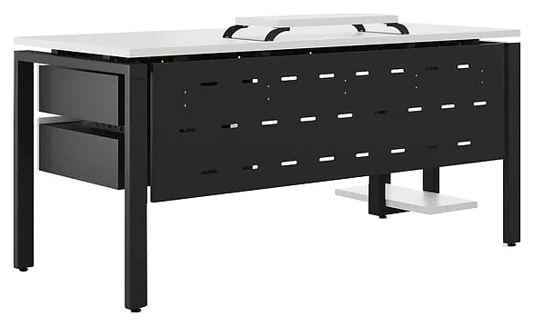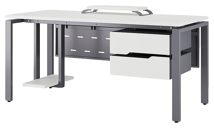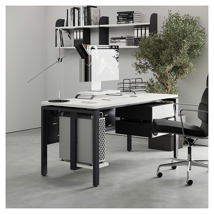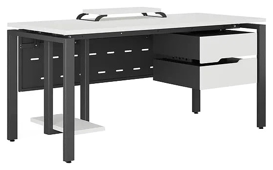 Компьютерный стол Кобор KP-180/80 graphite/premium используется в офисных помещениях и кабинетах руководителей. Модель оснащена П-образными опорами. Каркас выполнен из металла, выкрашенного в цвет графит муар (RAL7024), столешница – из ламинированной древесно-стружечной плиты (ЛДСП) цвета белый премиум (W1000 ST9). Опции (заказываются отдельно):