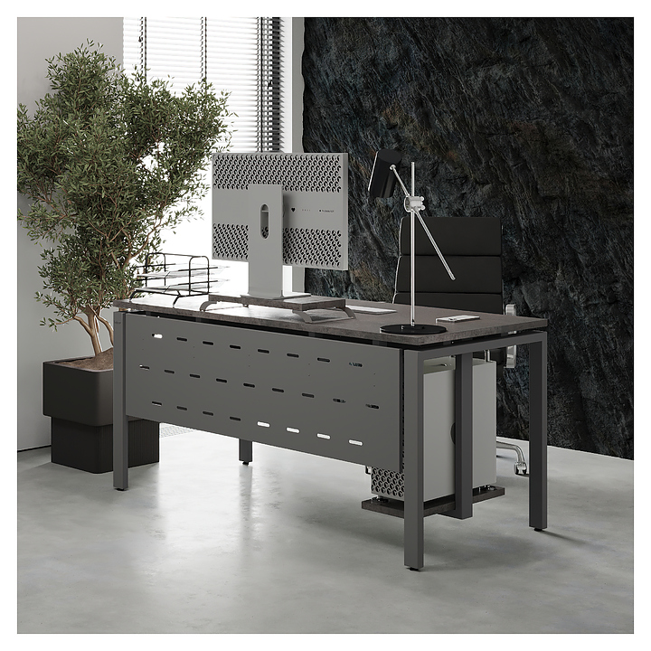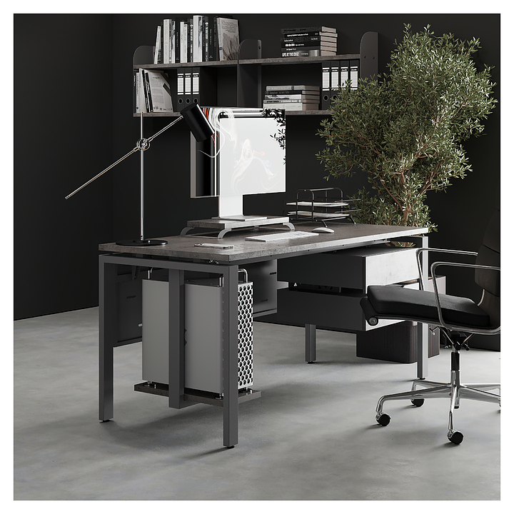 Компьютерный стол Кобор KP-80/70 aluminum/chicago используется в офисных помещениях и кабинетах руководителей. Модель оснащена П-образными опорами. Каркас выполнен из металла, выкрашенного в цвет алюминиевый металлик (RAL9006), столешница – из ламинированной древесно-стружечной плиты (ЛДСП) цвета бетон чикаго (F186 ST9). Опции (заказываются отдельно):