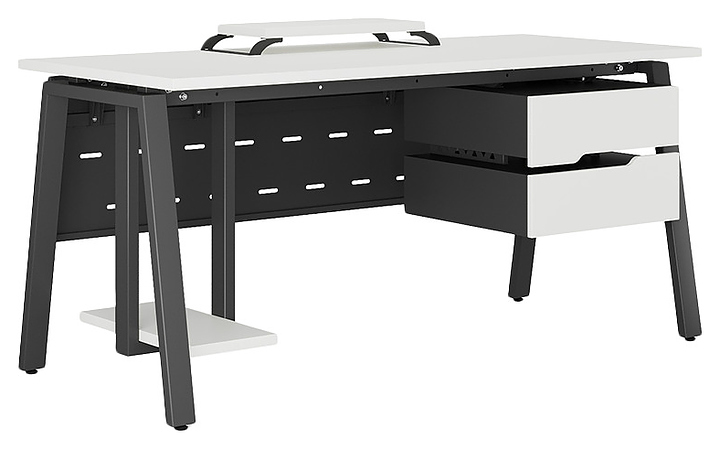 Компьютерный стол Кобор KA-160/60 black/premium используется в офисных помещениях и кабинетах руководителей. Модель оснащена A-образными опорами. Каркас выполнен из металла, выкрашенного в цвет черный муар (RAL9005), столешница – из ламинированной древесно-стружечной плиты (ЛДСП) цвета белый премиум (W1000 S9). Опции (заказываются отдельно):