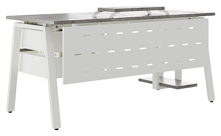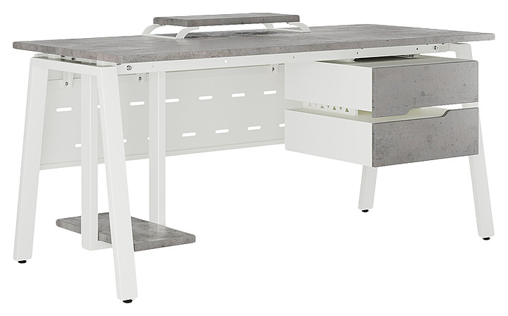 Компьютерный стол Кобор KA-180/80 white/chicago используется в офисных помещениях и кабинетах руководителей. Модель оснащена A-образными опорами. Каркас выполнен из металла, выкрашенного в цвет белый муар (RAL9016), столешница – из ламинированной древесно-стружечной плиты (ЛДСП) цвета бетон чикаго (F186 ST9). Опции (заказываются отдельно):