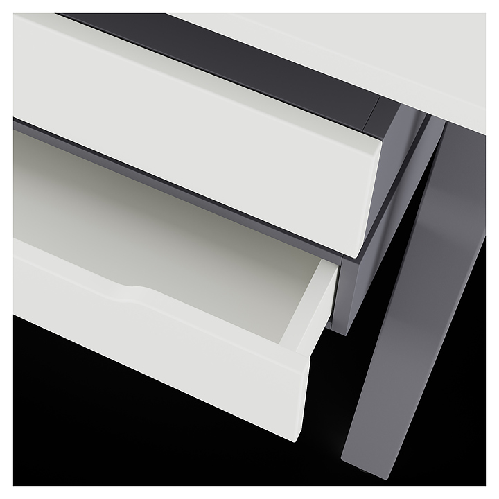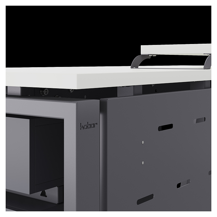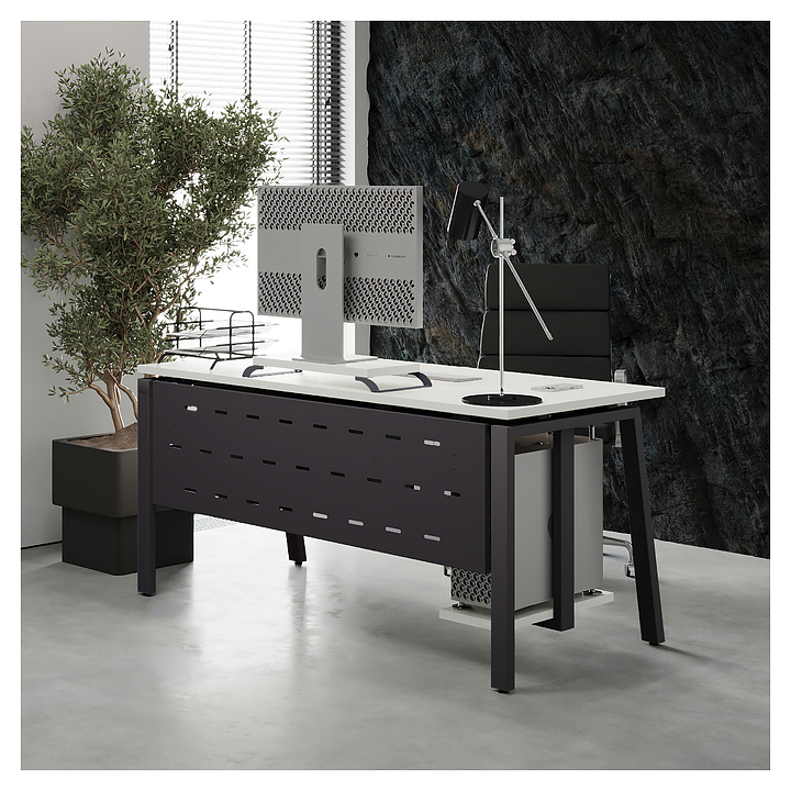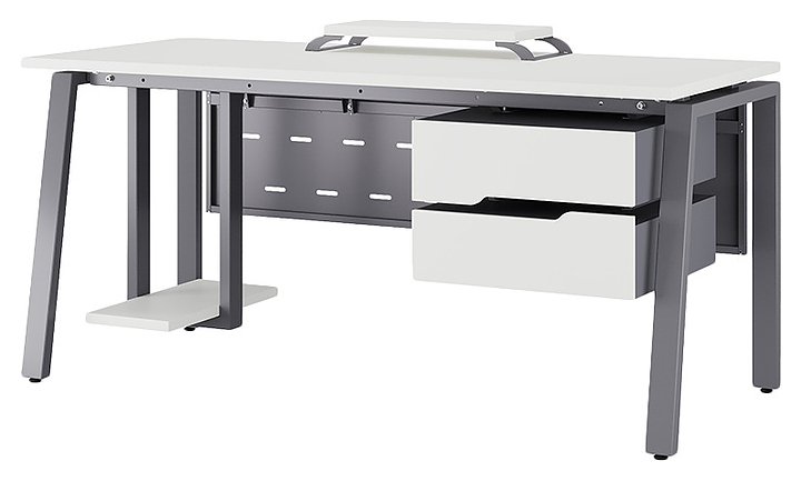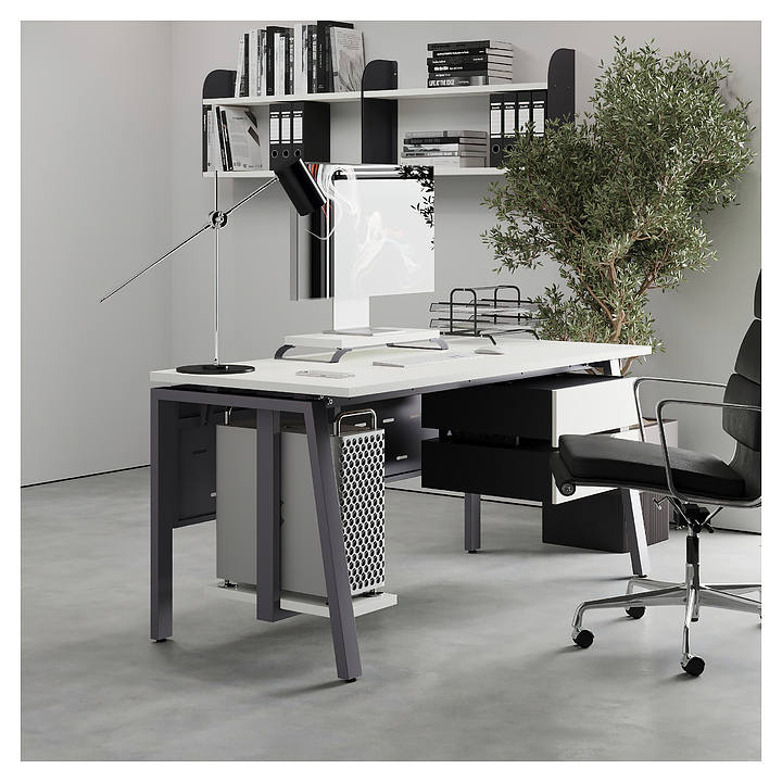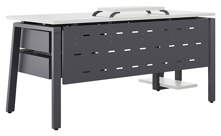 Компьютерный стол Кобор KAB-80/70 graphite/premium используется в офисных помещениях и кабинетах руководителей. Модель оснащена A-образными опорами со скошенными фронтальными сегментами. Каркас выполнен из металла, выкрашенного в цвет графит муар (RAL7024), столешница – из ламинированной древесно-стружечной плиты (ЛДСП) цвета белый премиум (W1000 ST9). Опции (заказываются отдельно):