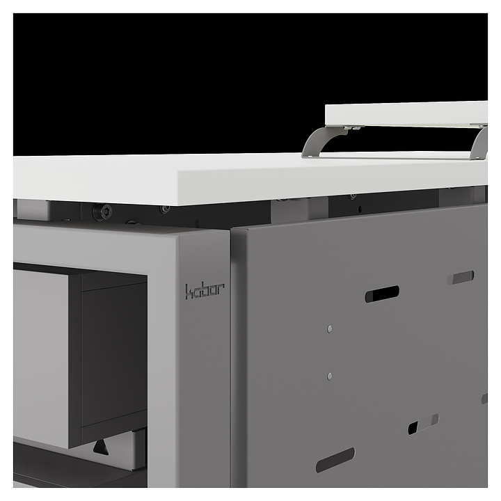 Компьютерный стол Кобор КAB-80/70 aluminum/premium используется в офисных помещениях и кабинетах руководителей. Модель оснащена A-образными опорами со скошенными фронтальными сегментами. Каркас выполнен из металла, выкрашенного в цвет алюминиевый металлик (RAL9006), столешница – из ламинированной древесно-стружечной плиты (ЛДСП) цвета белый премиум (W1000 ST9). Опции (заказываются отдельно):