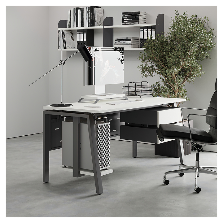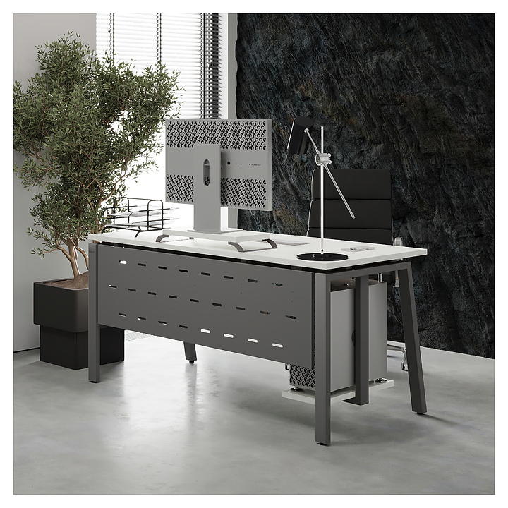 Компьютерный стол Кобор КAB-180/80 aluminum/premium используется в офисных помещениях и кабинетах руководителей. Модель оснащена A-образными опорами со скошенными фронтальными сегментами. Каркас выполнен из металла, выкрашенного в цвет алюминиевый металлик (RAL9006), столешница – из ламинированной древесно-стружечной плиты (ЛДСП) цвета белый премиум (W1000 ST9). Опции (заказываются отдельно):