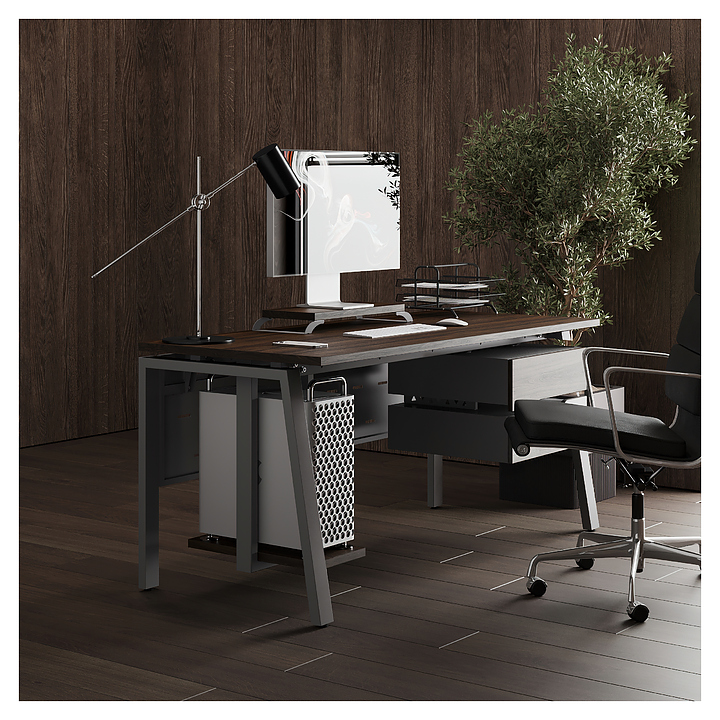 Компьютерный стол Кобор KAB-120/60 aluminum/charlston используется в офисных помещениях и кабинетах руководителей. Модель оснащена A-образными опорами со скошенными фронтальными сегментами. Каркас выполнен из металла, выкрашенного в цвет алюминиевый металлик (RAL9006), столешница – из ламинированной древесно-стружечной плиты (ЛДСП) цвета дуб чарльстон (H3154 ST36).