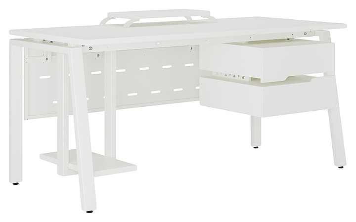 Компьютерный стол Кобор КAB-180/60 white/premium используется в офисных помещениях и кабинетах руководителей. Модель оснащена A-образными опорами со скошенными фронтальными сегментами. Каркас выполнен из металла, выкрашенного в цвет белый муар (RAL9016), столешница – из ламинированной древесно-стружечной плиты (ЛДСП) цвета белый премиум (W1000 ST9). Опции (заказываются отдельно):
