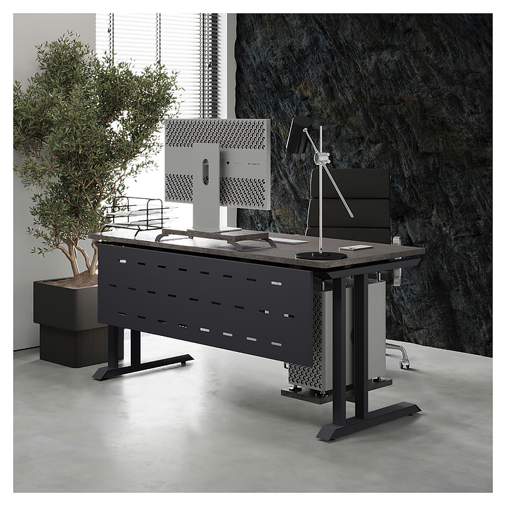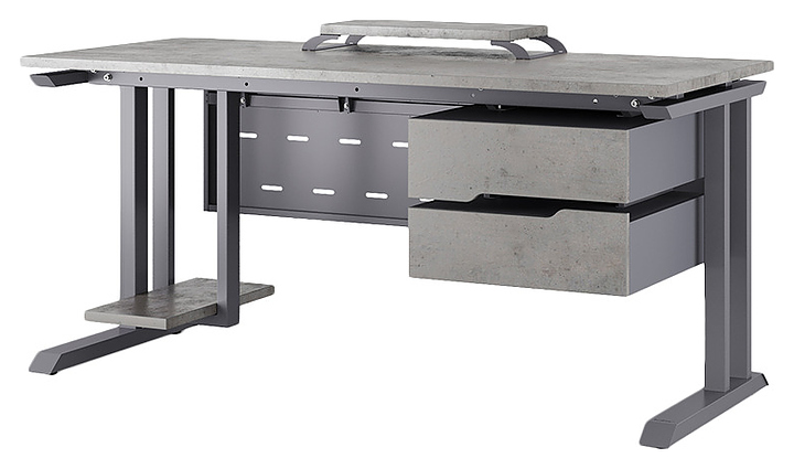 Компьютерный стол Кобор KL1-100/60 graphite/chicago используется в офисных помещениях и кабинетах руководителей. Модель оснащена L-образными опорами. Каркас выполнен из металла, выкрашенного в цвет графит муар (RAL7024), столешница – из ламинированной древесно-стружечной плиты (ЛДСП) цвета бетон чикаго (F186 ST9). Опции (заказываются отдельно):