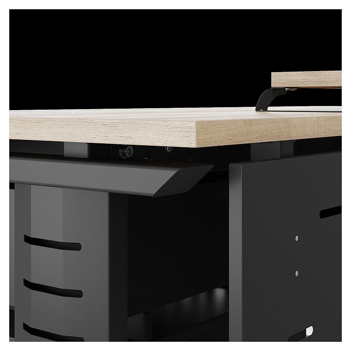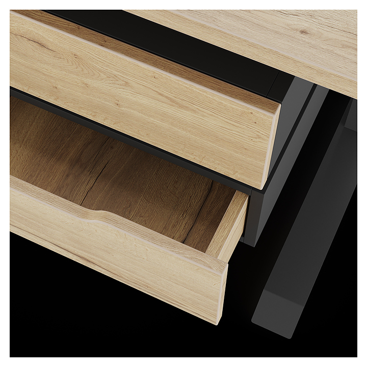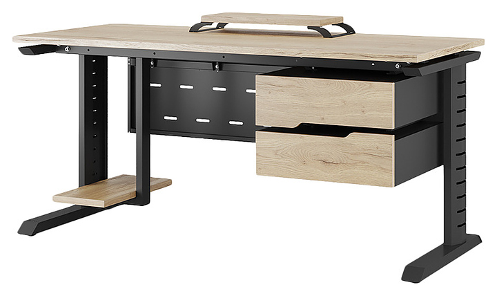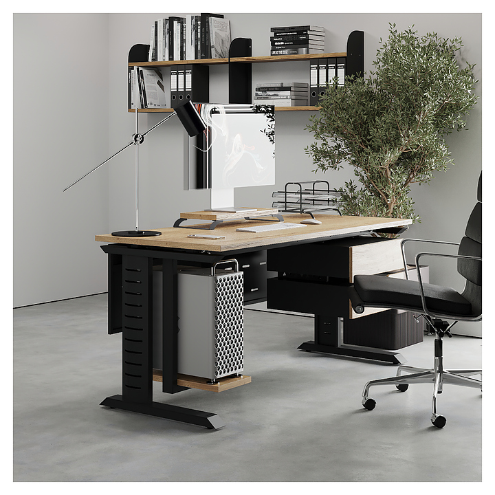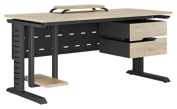 Компьютерный стол Кобор KL2-80/70 black/natural используется в офисных помещениях и кабинетах руководителей. Модель оснащена L-образными опорами с декоративными вставками на боковинах. Каркас выполнен из металла, выкрашенного в цвет черный муар (RAL9005), столешница – из ламинированной древесно-стружечной плиты (ЛДСП) цвета натуральный дуб (H1180 ST37). Опции (заказываются отдельно):